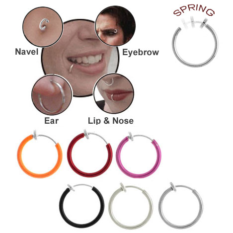 This exciting non-piercing body jewelry is specifically designed to be worn anywhere. You can wear this fake spring hoop safely and comfortably not only on the ears, but also on the nose, belly button, eyebrow, and anywhere around the lips. No holes are required to wear them. Fun for all and all for fun! It has the effect of a real piercing without the pain and permanence of a hole! Everyone will think that you have pierced. Simply spring open and release to close.