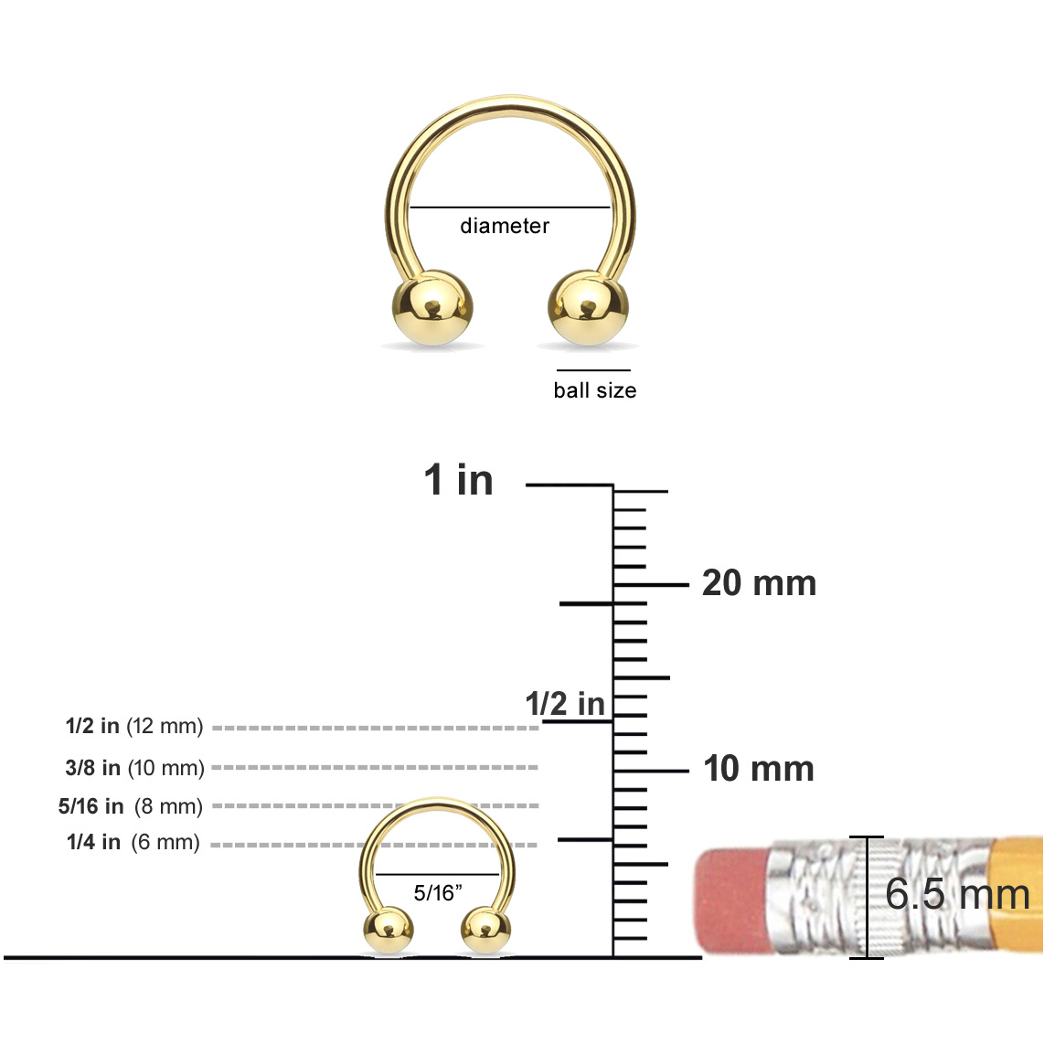 All our gold piercing jewelry is made of 14K solid gold (no vermeil, plated, or filled), material that is highly recommended by APP (Association of Professional Piercers). Gold higher than 18K is not adequate for body jewelry because it can easily be scratched or nicked. Q : Is this sold as a set or just one? thank you A : Sold individually. Q : IS this large enough for a woman's nipple? or is it very small only for male nipple? A : 14G 1/2 or bigger is recommended for female nipple piercing. You can measure your current jewelry that fits or visit any local piercing studios get the exact measurement. Thank you. Q : What is a good size for septum piercing? A : 16G 3/8" is the most common size for septum piercing. Q : is this real gold A : Yes, we guarantee all precious metals used in our gold and platinum products that have 14K gold, platinum, and diamonds in the product name and description are guaranteed to meet the level of purity and all diamond products are authentic, conflict-free, and 100% ethically sourced genuine natural diamonds. Q : Can this be used as an earring? A : Yes, it can. Q : Can I purchase extra 3mm ball ends? A : Yes, you may purchase a replacement ball at https://bodyjewelryfactory.com/dia101acc.html Make sure to write the item# and select the gauge. Q : Do you sell spike ends for this product in 18g 6mm? A : We apologize but we do not. |
