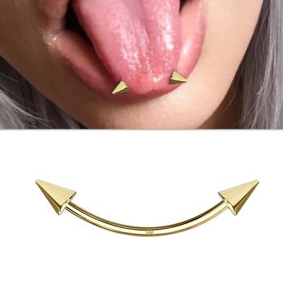 14K Gold Spike Snake Eyes Tongue Ring Curved Barbell - 16G