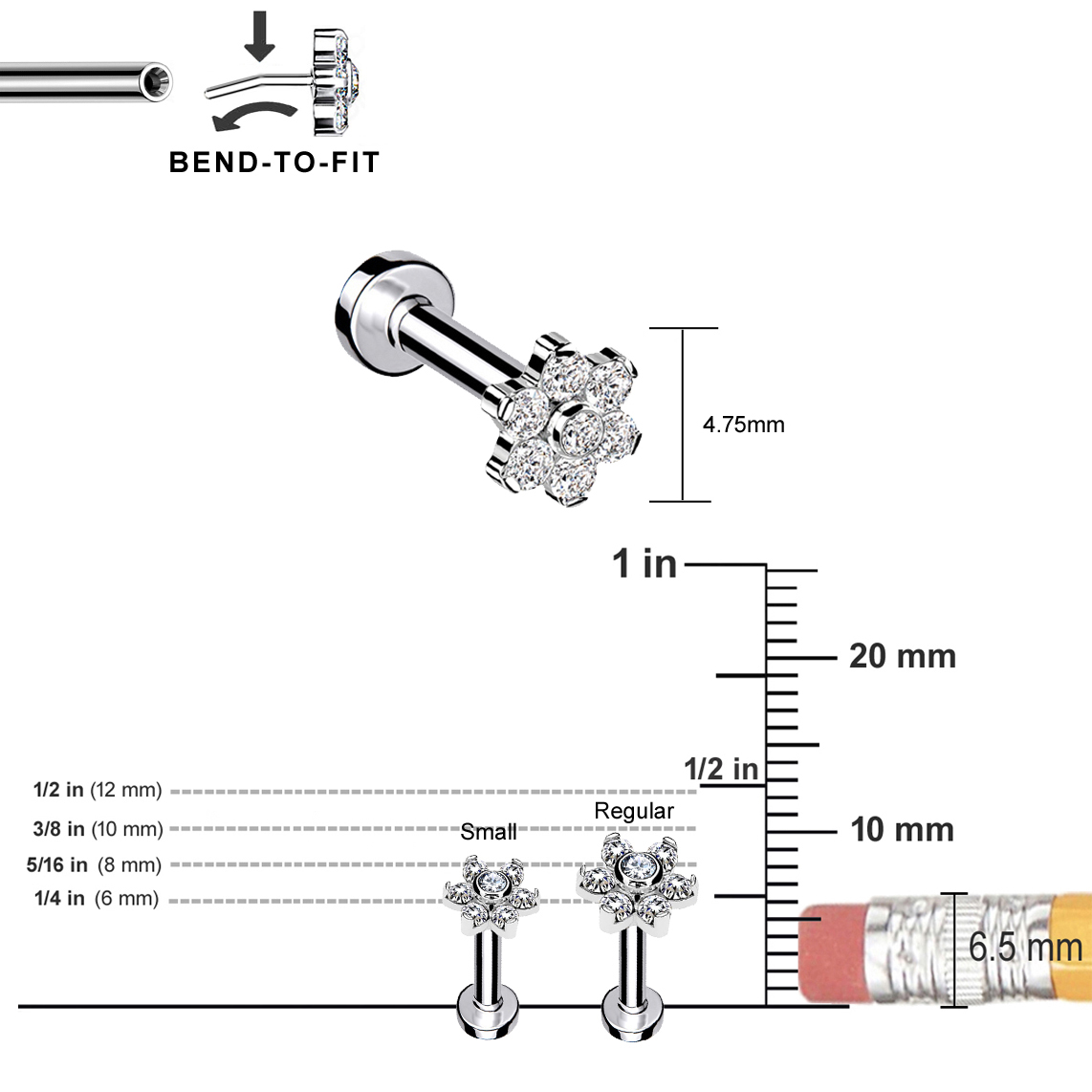 Threadless "Bend-To-Fit" Push-In jewelry uses the tension between the stud pin and the threadless post to stay together. Sightly bend the stud pin halfway into the post to create a spring tension that holds both pieces together securely. Perfect for both initial and fully healed piercings and great for cartilage, earlobe, nose, and lip piercings.